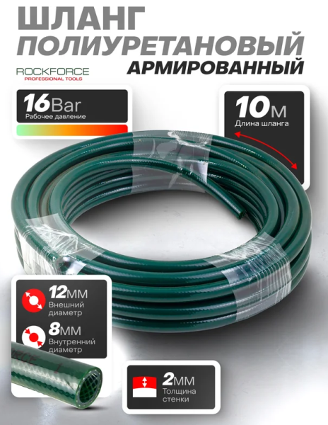 Шланг воздушный полиуретановый армированный нейлоновой нитью с размерами 8 х 12 мм х 10 метров от бренда ROCKFORCE является прочным и гибким инструментом для передачи воздуха. Он изготовлен из высококачественного полиуретанового материала, который обладает отличной стойкостью к износу.
