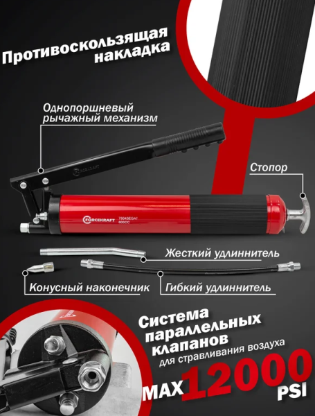 Шприц для нагнетания густой смазки от бренда FORCEKRAFT — это надёжный и удобный инструмент, предназначенный для точного нанесения смазки на контактирующие детали, шарниры и соединения. Он идеально подходит для обслуживания легковых автомобилей, тракторов и другой техники, как в автосервисе, так и при самостоятельном обслуживании.
