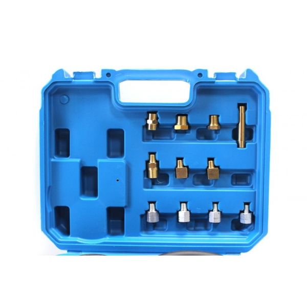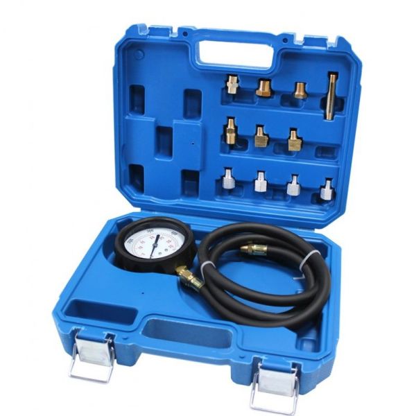Тестер давления масла в двигателе. Набор предназначен для измерения давления масла в ДВС и АКПП. Прибор измерения давления масла широко используют в автосервисах и ремонтных мастерских во время диагностики и технического обслуживания транспортных средств. Он состоит из манометра с легко читаемой шкалой, гибкого резинового шланга и набора резьбовых переходников. В комплект набора входит: 11 насадок для разных двигателей (Адаптер: резьба R1/8"DIN 2999;Адаптер: резьба 1/8"x27 NPT;Адаптер: резьба 1/4"x18 NPT;Адаптер: резьба 3/8"x20 UNF;Адаптер: резьба 1/2"x20 UNF;Адаптер: резьба M10x1,0;Адаптер: резьба M12x1,5;Адаптер: резьба M14x1,5;Адаптер: резьба M16x1,5;Адаптер: резьба M18x1,5;Адаптер под 90 градусный комплект уплотнильных колец), манометр в обрезиненном защитном кожухе с шлангом 1м, фирменный пластиковый кейс для удобного хранения и транспортировки набора. Диапазон измеряемого давления: от 0 до 35 Бар 0~500 psi ( улучшенная двойная шкала). Набор имеет богатую комплектацию и переходники с метрической и дюймовой резьбой, что позволяет использовать набор для диагностики автомобилей различных марок.