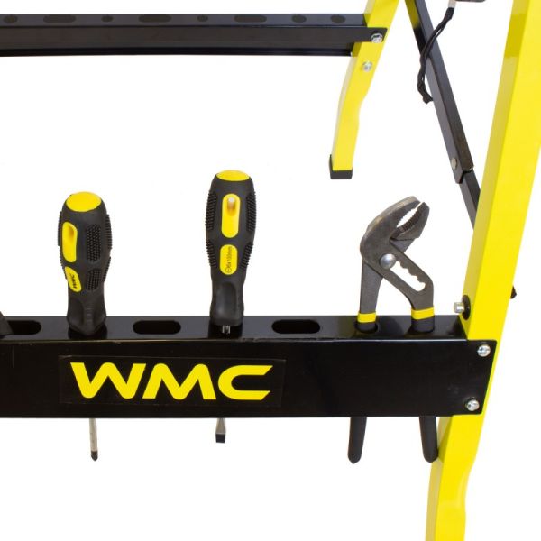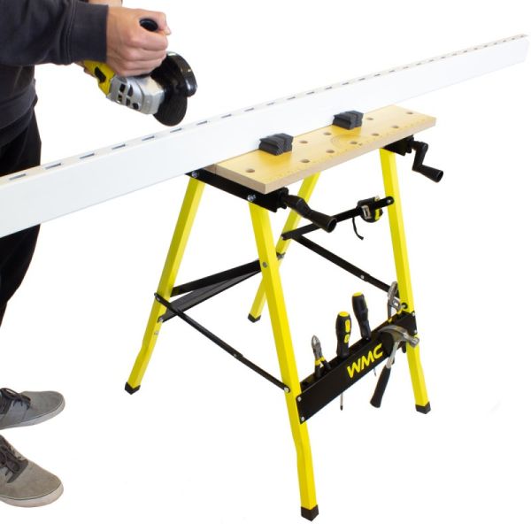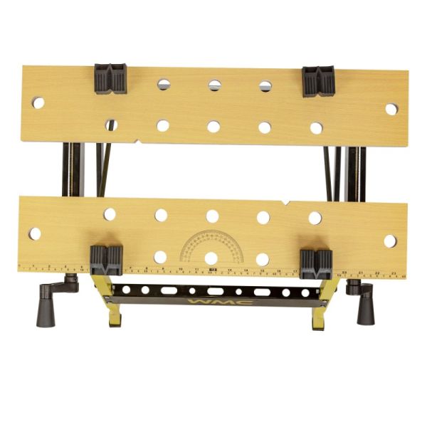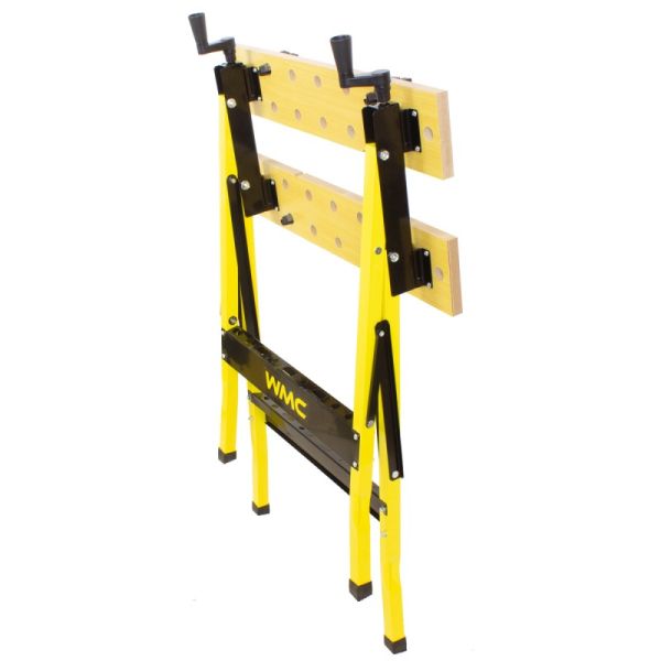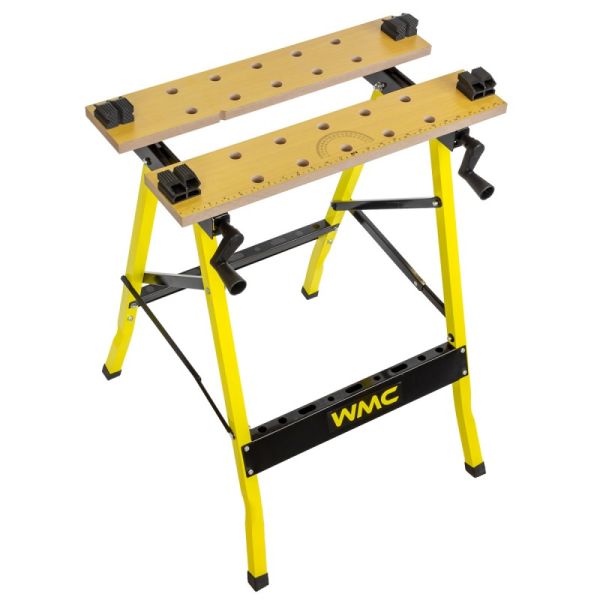 Верстак столярный металлический с разводной столешницей TG6101044 от WMC TOOLS – это незаменимый и универсальный помощник в мастерской, гараже и в домашних условиях. Верстак предназначен для проведения столярных и слесарных работ. Применяется при обработке материалов и различных форм заготовок. Верстак имеет две подвижные столешницы изготовленных из ДВП, двигающимся по направляющим металлическим опорам. С помощью двух ручек можно сдвигать или раздвигать столешницы, подгоняя под необходимый размер заготовки. Верстак слесарный очень мобильный, не тяжелый, но несмотря на это, максимальная нагрузка на него составляет до 100 кг. Универсального применения, стальной складной верстак занимает мало места при хранении. Благодаря складному каркасу удобен в хранении и транспортировке. Складной рабочий стол позволяет экономить место в мастерской и требует минимум времени для сборки. Для удобства работы, столешница оснащена отверстиями и фиксаторами заготовок любой формы. Мощная стальная конструкция и специальная форма рычагов увеличивают силу зажатия заготовки, а прорезиненные ножки обеспечивают надежную устойчивость верстака. Для поддержания порядка в мастерской в нижней части конструкции предусмотрены специальные отверстия для хранения инструментов.